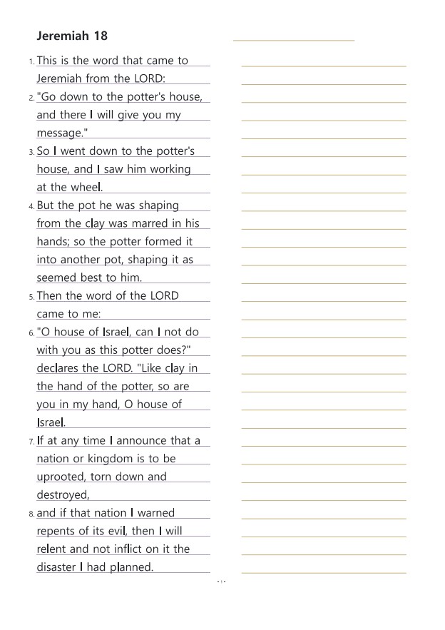 | Jeremiah 19 Handwrite the Bible 예레미야19장 영어성경필사 PDF (0) | 2024.08.26 |