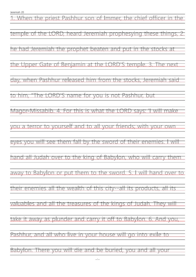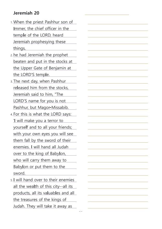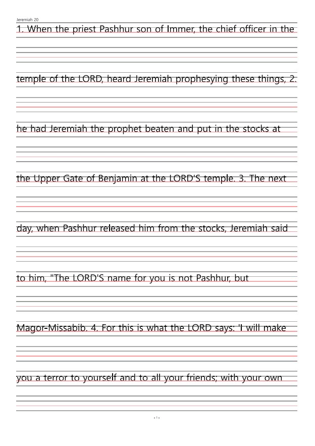 | Jeremiah 17 Handwrite the Bible 예레미야17장 영어성경필사 PDF (0) | 2024.08.26 |