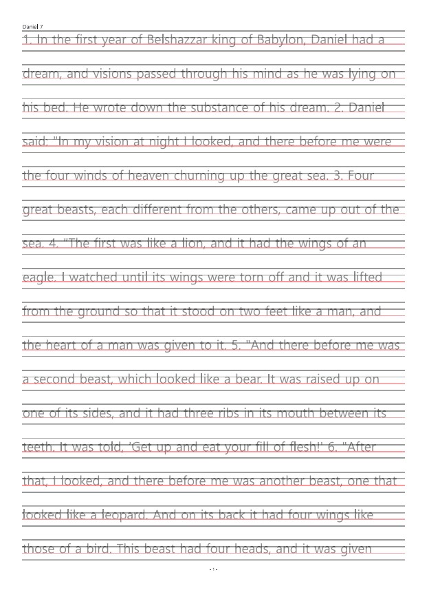 | Daniel 4 Handwrite the Bible 다니엘4장 영어성경필사 PDF (0) | 2024.08.30 |