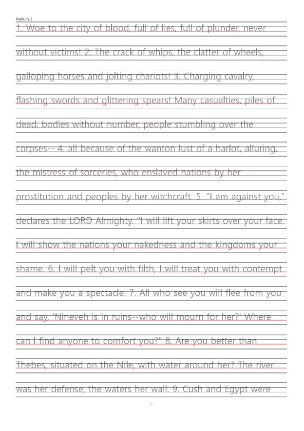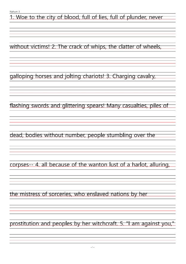 | Nahum 1 Handwrite the Bible 나훔1장 영어성경필사 PDF (1) | 2024.09.01 |