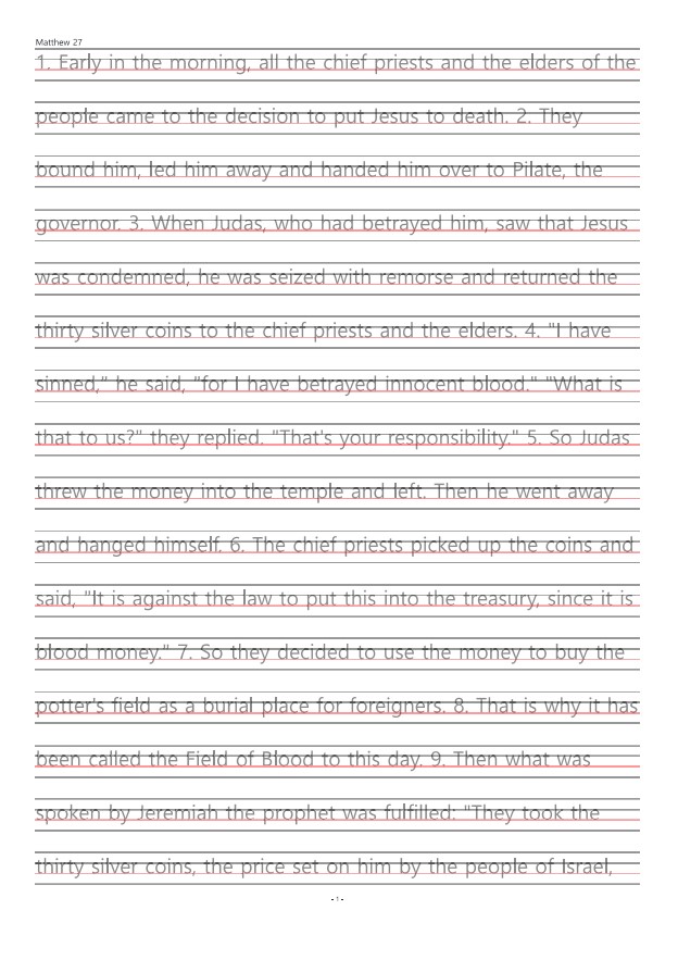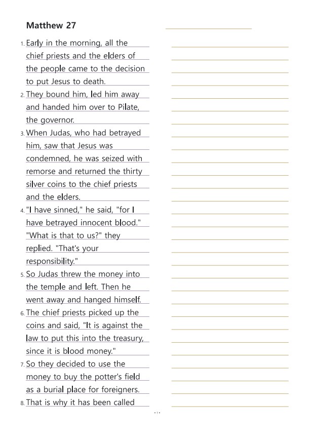 | Matthew 26 Handwrite the Bible 마태복음26장 영어성경필사 PDF (0) | 2024.09.04 |