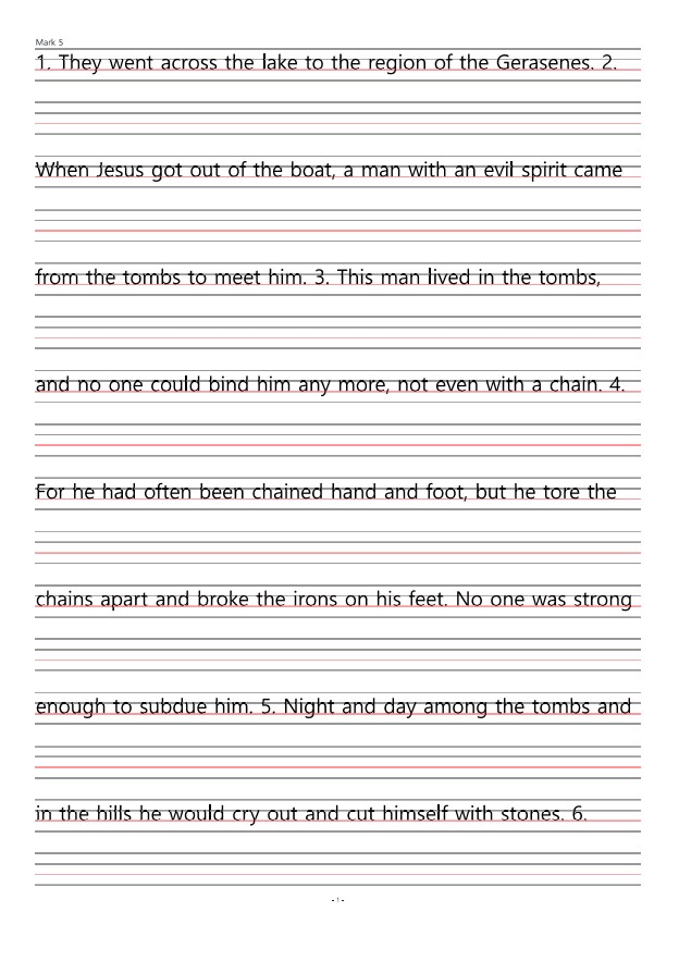 | Mark 4 Handwrite the Bible 마가복음4장 영어성경필사 PDF (1) | 2024.09.04 |