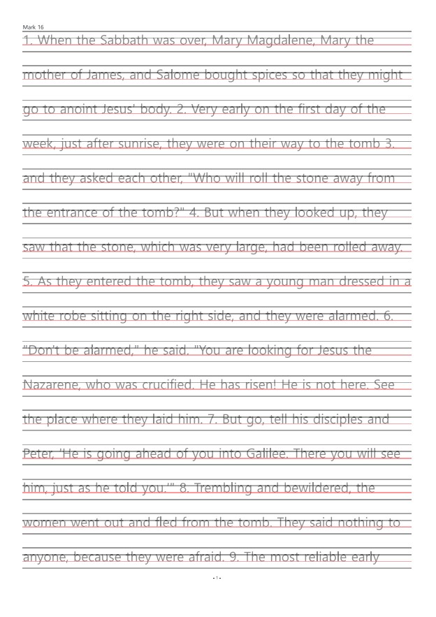 | Mark 15 Handwrite the Bible 마가복음15장 영어성경필사 PDF (0) | 2024.09.04 |