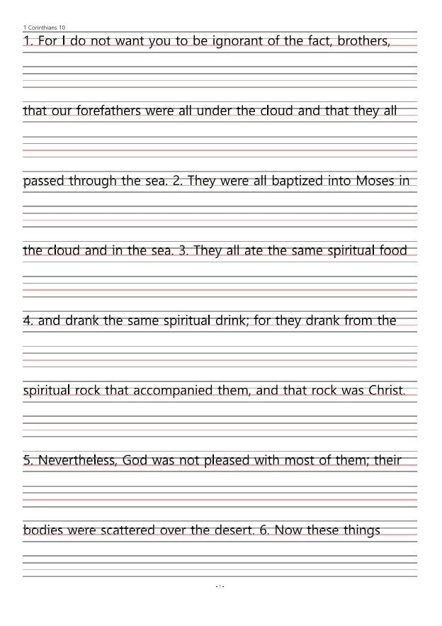 | 1 Corinthians 11 Handwrite the Bible 고린도전서11장 영어성경필사 PDF (0) | 2024.09.09 |