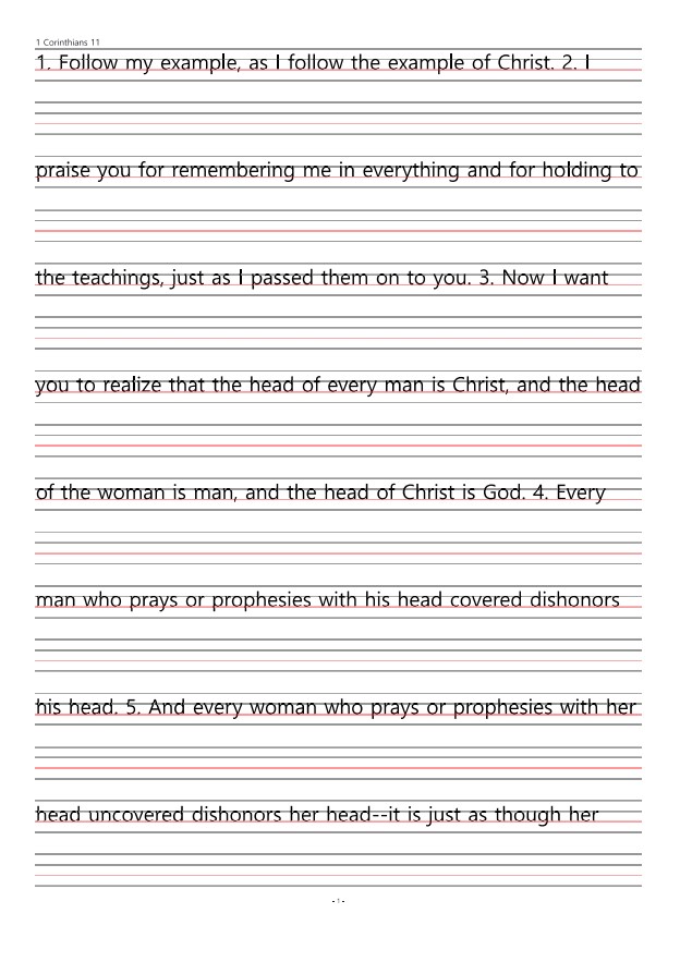 | 1 Corinthians 12 Handwrite the Bible 고린도전서12장 영어성경필사 PDF (0) | 2024.09.09 |