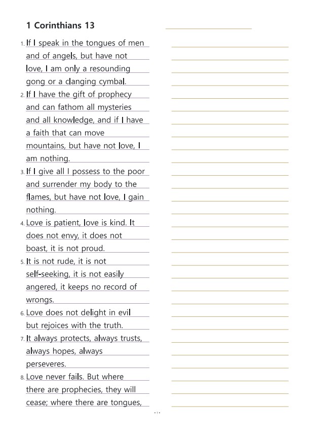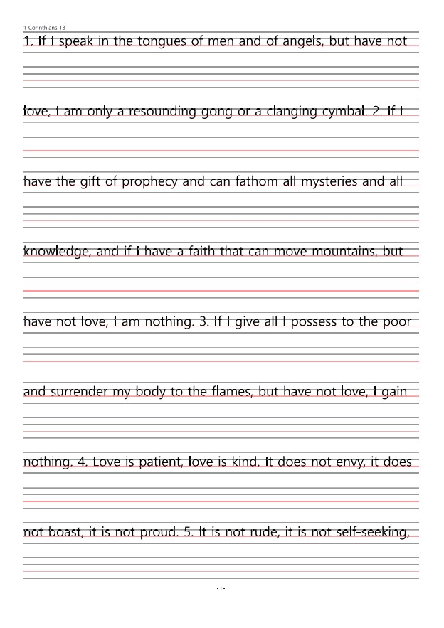 | 1 Corinthians 12 Handwrite the Bible 고린도전서12장 영어성경필사 PDF (0) | 2024.09.09 |