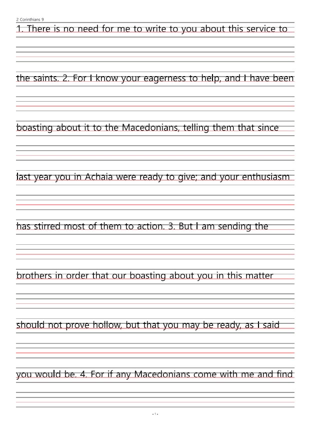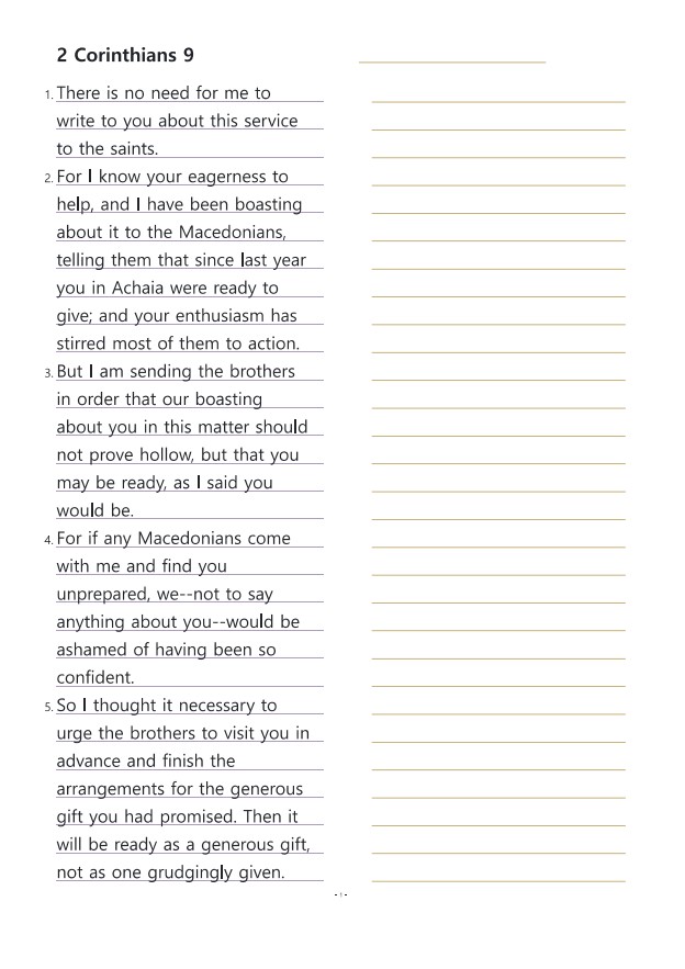 | 2 Corinthians 8 Handwrite the Bible 고린도후서8장 영어성경필사 PDF (1) | 2024.09.09 |
