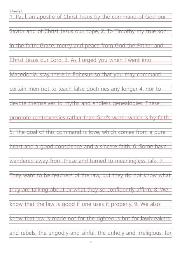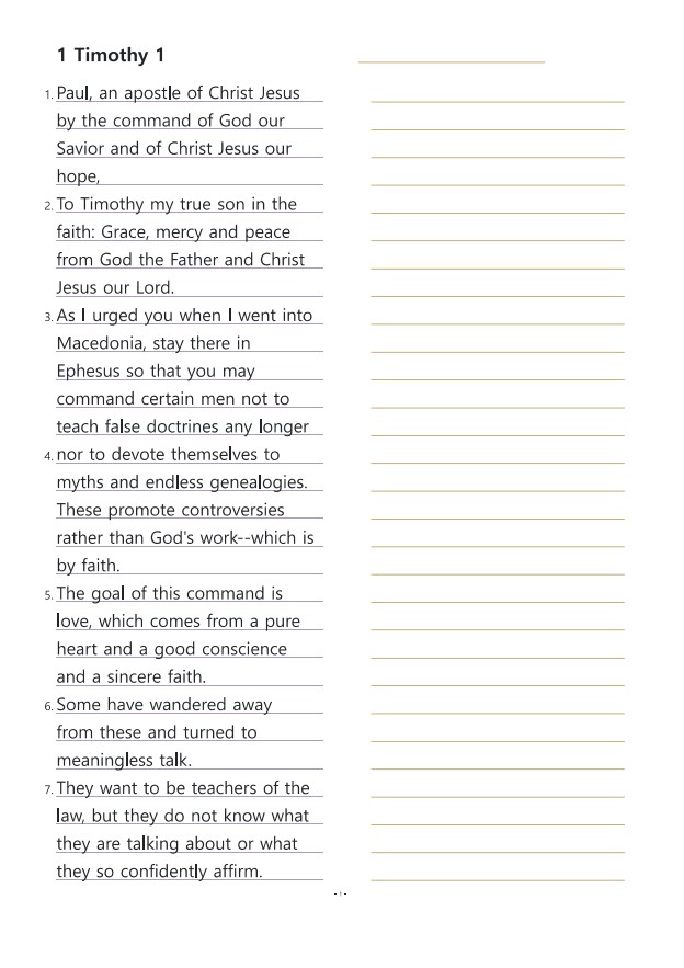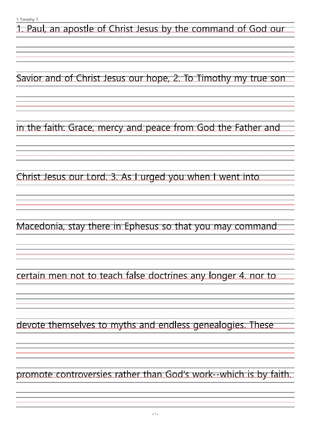 | 1 Timothy 2 Handwrite the Bible 디모데전서2장 영어성경필사 PDF (0) | 2024.09.11 |