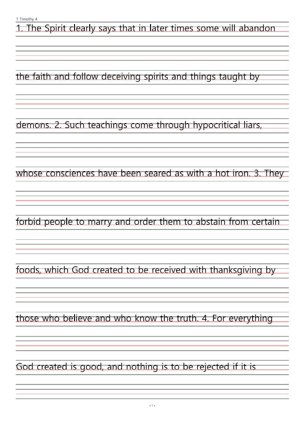 | 1 Timothy 1 Handwrite the Bible 디모데전서1장 영어성경필사 PDF (0) | 2024.09.11 |