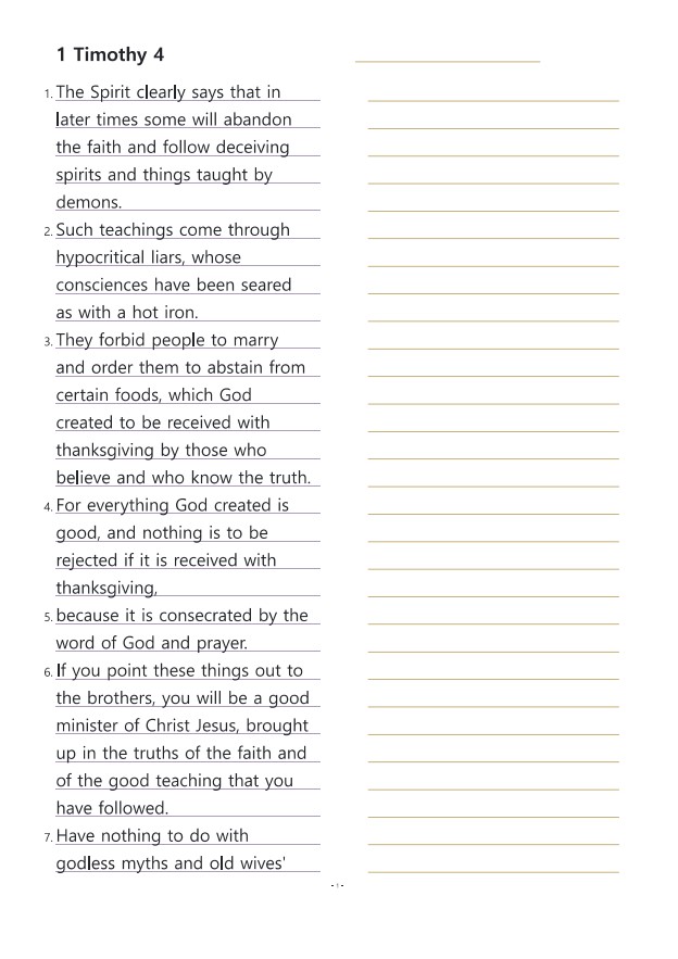 | 1 Timothy 6 Handwrite the Bible 디모데전서6장 영어성경필사 PDF (0) | 2024.09.11 |