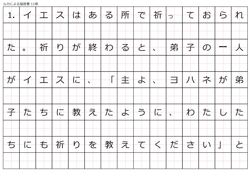 ルカ11:1 イエスはある所で祈っておられた。祈りが終わると、弟子の一人がイエスに、「主よ、ヨハネが弟子たちに教えたように、わたしたちにも祈りを教えてください」と言った。