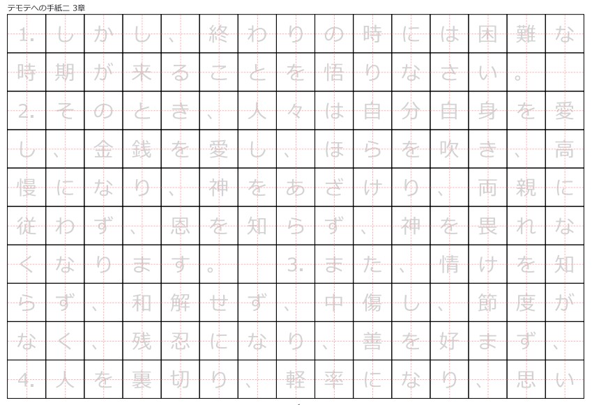 | テモテへの手紙二 2 書き写し 디모데후서2장 일본어성경필사 PDF (0) | 2024.11.24 |