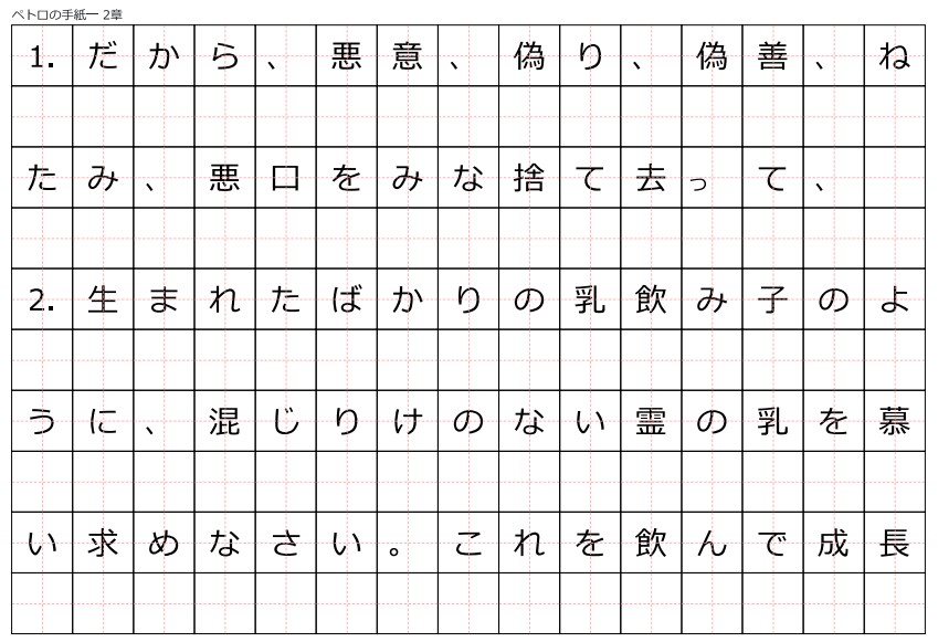 一ペト2:2 生まれたばかりの乳飲み子のように、混じりけのない霊の乳を慕い求めなさい。これを飲んで成長し、救われるようになるためです。